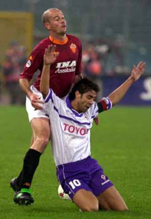 Восьмой тур заканчивался встречей бывшей и нынешней команд Габриэля Батистуты. Сам аргентинский форвард очень хотел отличиться в этом матче, и за семь минут до конца ему это удалось. Несравненным по красоте и мощи ударом он вогнал мяч в сетку над ошарашенным Франческо Тольдо. Секундой позже его обнимали партнеры по команде, а великий аргентинец … плакал. |