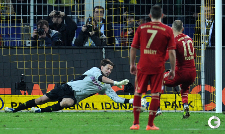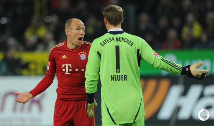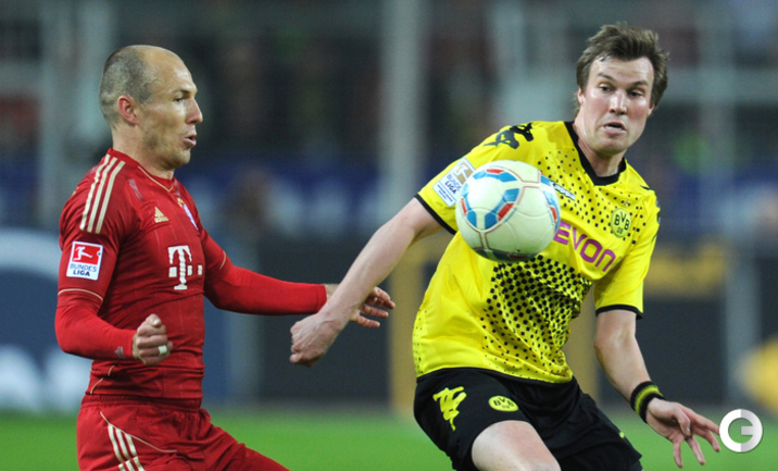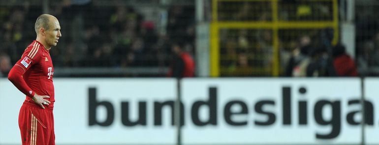 Футбол. Чемпионат Германии. Бундеслига. 30-й тур. "Боруссия" Д - "Бавария" - 1:0 (0:0). Гол: Левандовски, 77. Нереализованный пенальти: Роббен, 85 (вратарь). В ключевой встрече в борьбе за чемпионство команда Юргена Клоппа одолела дома "Баварию", за четыре тура до конца турнира увеличив отрыв от мюнхенского клуба до шести очков. Фото AFP