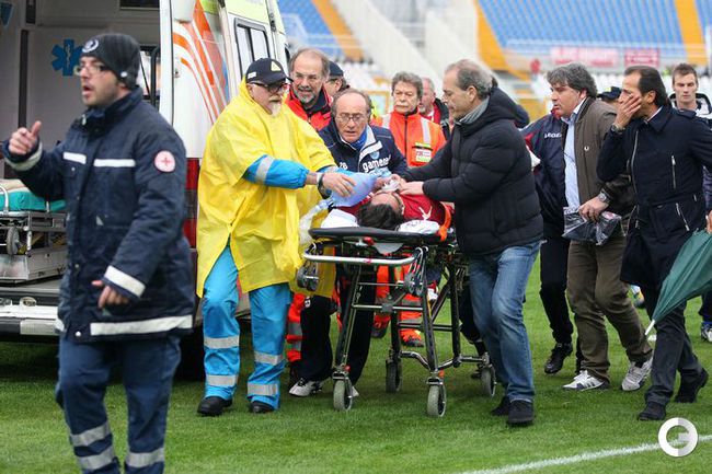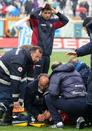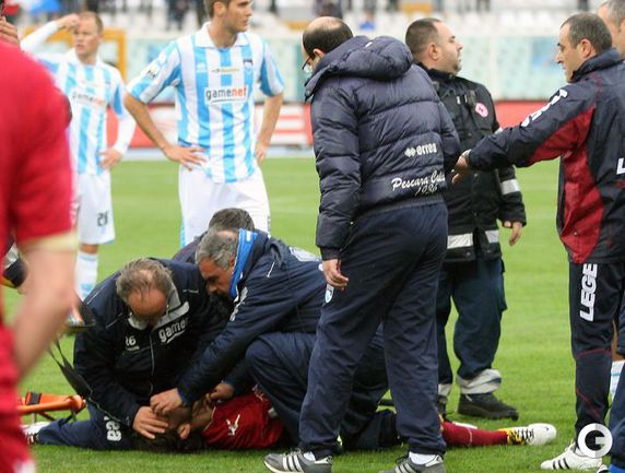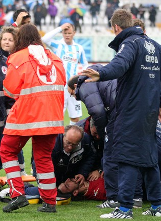 Футбол. Чемпионат Италии. Полузащитник "Ливорно" Пьермарио Морозини, перенесший сердечный приступ во время матча серии В с "Пескарой", скончался по пути в больницу. Футболист на 30-й минуте встречи неожиданно упал на газон, и после оказания первой помощи прямо на поле с применением дефибриллятора был отправлен в больницу, но, к сожалению, врачам так и не удалось вернуть Морозини к жизни. Фото AFP и REUTERS