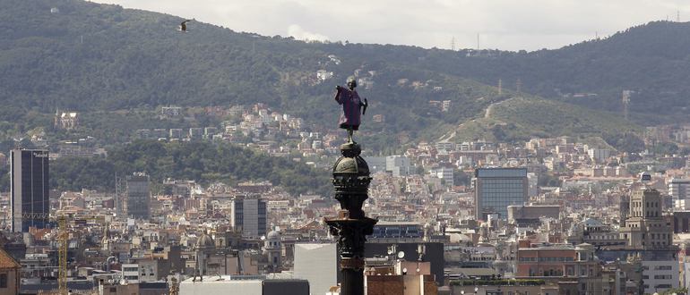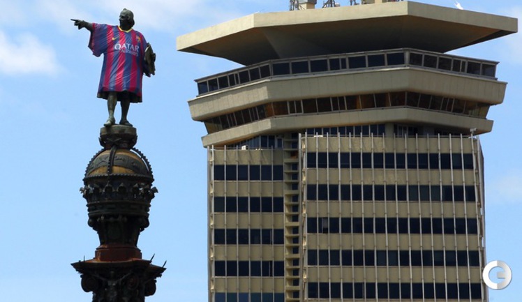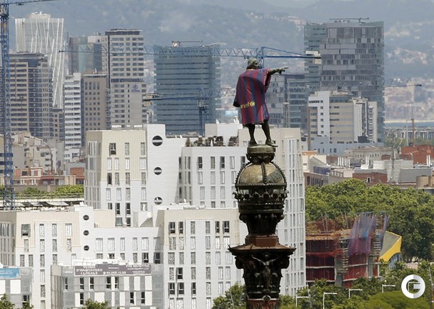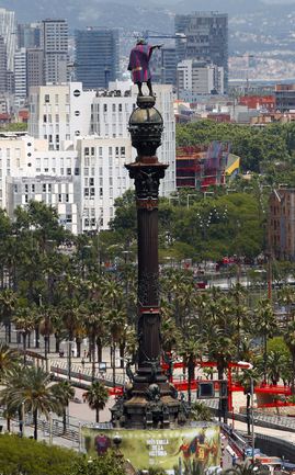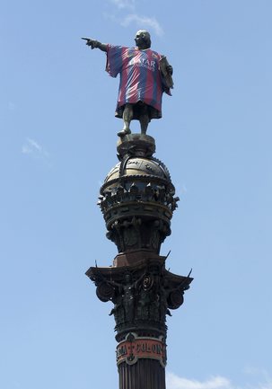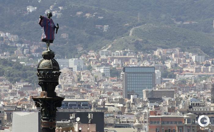Грандиозный монумент, установленный в конце XIX века в порту Барселоны в честь первооткрывателя американского континента, мореплавателя Христофора Колумба, облачили в гигантскую футболку чемпиона Испании. Это новая форма каталонского клуба, которая уже появилась в продаже. Размеры памятника весьма внушительны: общая высота составляет около 60 метров, высота колонны — 40 метров, сама статуя Колумба — более 7 метров. Фото REUTERS