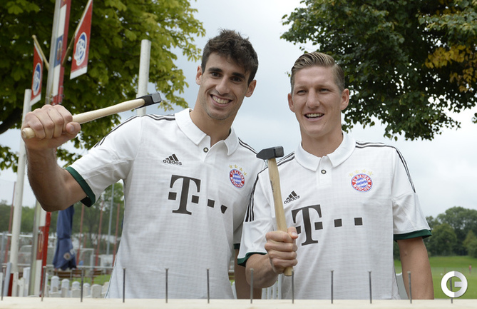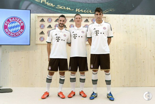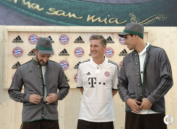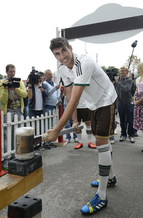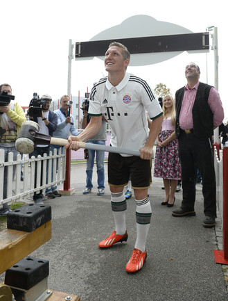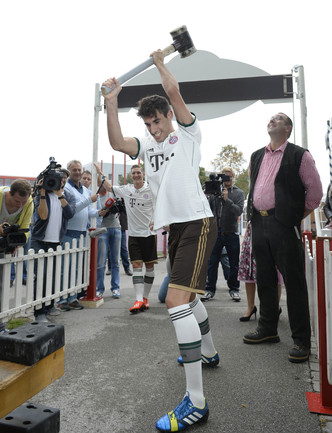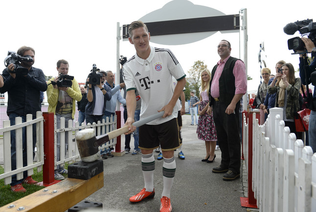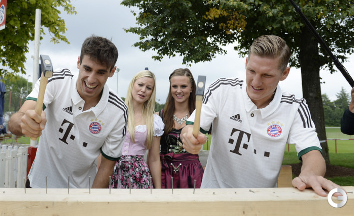 В Мюнхене игроки "Баварии" Хави Мартинес, Бастиан Швайнштайгер и Диего Контенто представили новую клубную форму. Презентация прошла во время ежегодной ярмарки, на которой игроки клуба приняли участия в традиционых баварских забавах с молотками. Фото AFP