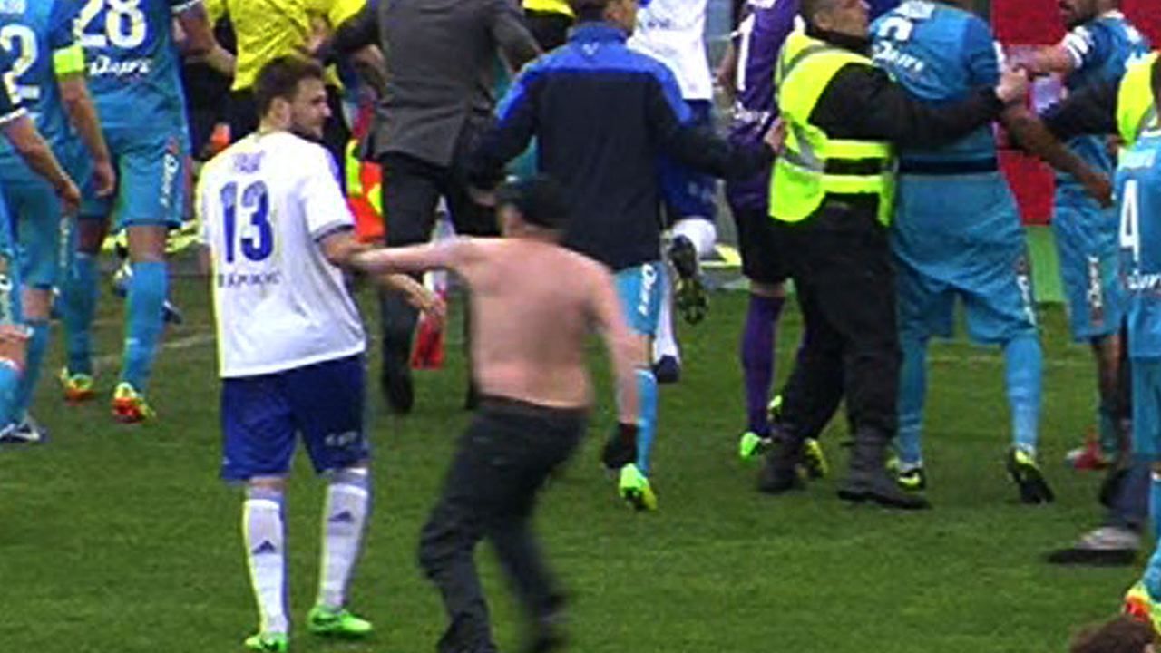 А на 87-й минуте на "Петровском" вспыхнули гораздо более масштабные беспорядки, в результате матч не был доигран. Болельщики с "виража" выбежали на поле, а защитник "Динамо" Владимир Гранат получил удар по лицу от болельщика "Зенита".