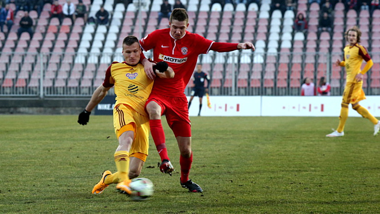 В борьбе за мяч - Вячеслав КАРАВАЕВ (в центре). Фото - fkdukla.cz