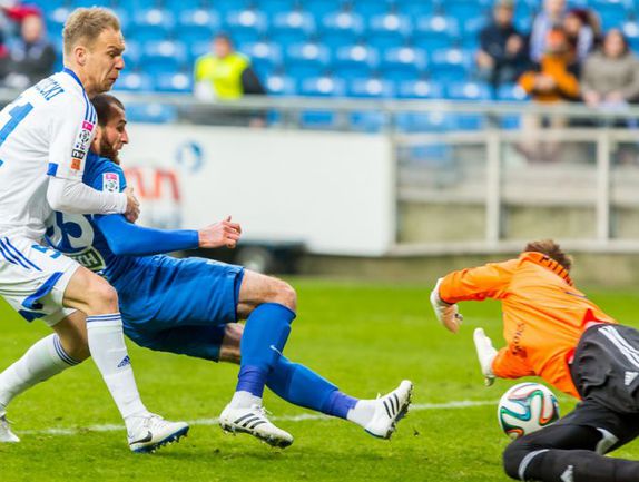 В борьбе за мяч - Вячеслав КАРАВАЕВ (в центре). Фото - fkdukla.cz
