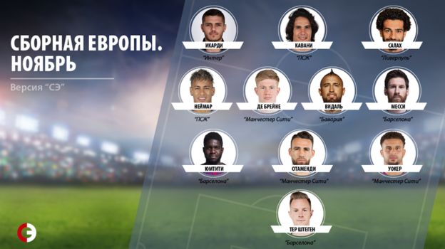 В сборную ноября вошли (4-3-3): тер Штеген ("Барселона", 6 голосов); Уокер ("Манчестер Сити", 4), Отаменди ("Манчестер Сити", 4), Юмтити ("Барселона", 6), Жорди Альба ("Барселона", 4); Де Брейне ("Манчестер Сити", 8), Эриксен ("Тоттенхэм", 5), Неймар ("ПСЖ", 5); Салах ("Ливерпуль", 9), Кавани ("ПСЖ", 7), Икарди ("Интер", 6).