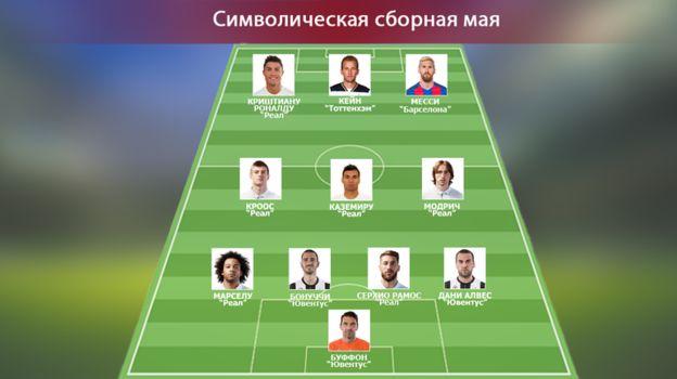 В сборную мая вошли: Буффон ("Ювентус", 7 голосов); Дани Алвес ("Ювентус", 10), Серхио Рамос ("Реал", 10), Бонуччи ("Ювентус", 7), Марселу ("Реал", 9); Модрич ("Реал", 7), Каземиру ("Реал", 5), Кроос ("Реал", 5); Месси ("Барселона", 8), Кейн ("Тоттенхэм", 6), Криштиану Роналду ("Реал", 12).
