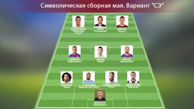 Вариант "СЭ" выглядит так: Миньоле ("Ливерпуль"); Дани Алвес, Серхио Рамос, Отаменди ("Манчестер Сити"), Марселу; Месси, Кроос, Неймар ("Барселона"); Джеко ("Рома"), Кейн, Криштиану Роналду.