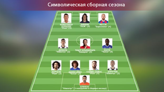 В сборную сезона вошли: Буффон ("Ювентус", 3 попадания в сборные месяца); Бонуччи ("Ювентус", 3), Серхио Рамос ("Реал", 4), Давид Луиз ("Челси", 3), Марселу ("Реал", 3); Канте ("Челси", 4), Тиагу Алькантара ("Бавария", 3), Дибала ("Ювентус", 2); Месси ("Барселона", 4), Кавани ("ПСЖ", 3), Криштиану Роналду ("Реал", 3).