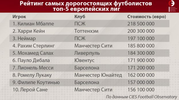 Лидером стал нападающий "ПСЖ" и сборной Франции Кильян Мбаппе. Он оценивается в 218,5 миллиона евро.