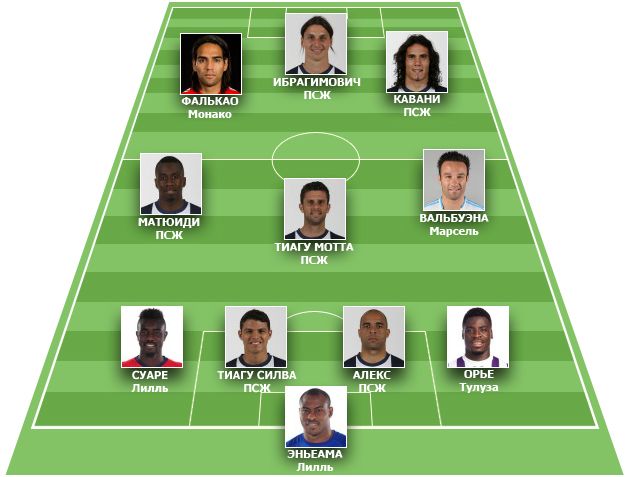 ЭНЬЕАМА Лилль – ОРЬЕ Тулуза, АЛЕКС ПСЖ, ТИАГУ СИЛВА ПСЖ, СУАРЕ Лилль – ВАЛЬБУЭНА Марсель, ТИАГУ МОТТА ПСЖ, МАТЮИДИ ПСЖ – ФАЛЬКАО Монако, ИБРАГИМОВИЧ ПСЖ, КАВАНИ ПСЖ .