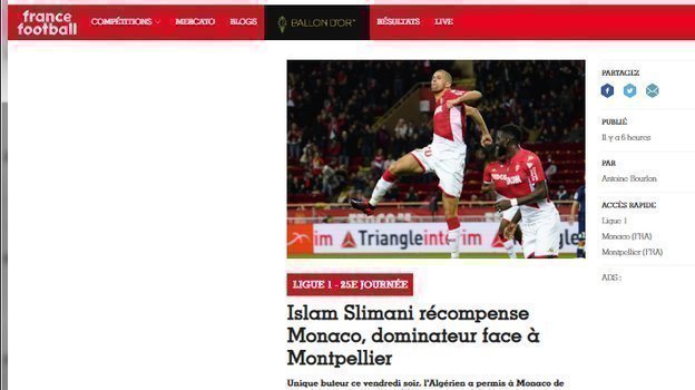 «В матче открытия 25-го тура «Монако» победил «Ренн» благодаря голу Ислама Слимани и поднялся на 5-е место в таблице, всего на три очка отставая от идущего третьим «Ренна». Монегаски выставили яркое атакующее трио Слимани — Бен Йеддер — Йоветич и выиграли на стадионе «Луи II». И пусть счет довольно скользкий, но «Монако» играл быстрее и точнее, и имел множество возможностей забить еще.
