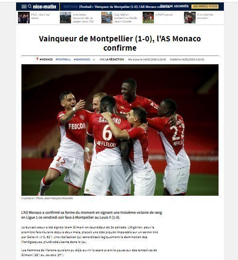 «Монако» подтвердил отличную текущую форму, одержав третью победу подряд в лиге 1 — обыгран «Монпелье» на стадионе «Луи II». Вновь главным героем стал Ислам Слимани, забивший решающий гол. Алжирец совершил прыжок в чужой штрафной, откликнувшись на подачу Головина с углового. И этот мяч стал логичным отражением того преимущества, которое имели монегаски на протяжении всего матча. Команда Роберта Морено могла запросто забить еще до перерыва, не использовав несколько моментов. Благодаря этой победе «Монако» поднялся в топ-5 в турнирной таблице".