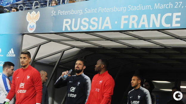 Сборная Франции провела тренировку накануне завтрашнего контрольного матча против сборной России в Санкт-Петербурге.
