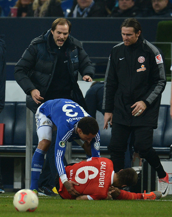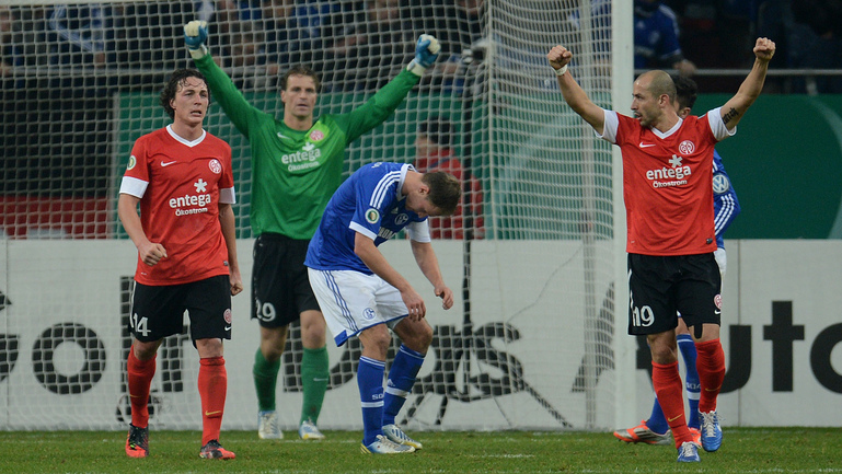 Футбол. Кубок Германии. 1/8 финала. "Шальке" - "Майнц" - 1:2 (0:1). Голы: Калиджури, 30 (0:1). Хюнтелар, 75 (1:1). Мюллер, 82 (1:2). "Карлсруэ" - "Фрайбург" - 0:1 (0:1). Гол: Шмид, 2. "Аугсбург" - "Бавария" - 0:2 (0:1). Голы: Гомес, 27, Шакири, 85. Удаление: Рибери, 47 (Б). "Киккер Оффенбах" - "Фортуна" - 2:0 (0:0). Голы: Фетш, 76, Фоглер, 85. Фото AFP и REUTERS