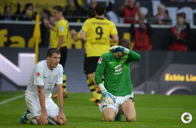 Футбол. Чемпионат Германии. Бундеслига 1. 2-й тур. "Боруссия" (Дортмунд) – "Айнтрахт" (Брауншвейг) – 2:1 (0:0). Голы: Хофманн (Хуммельс), 75 (1:0). Ройс, 86, с пенальти (2:0). Левандовски, 89, в свои ворота (2:1). "Боруссия" (Дортмунд): Вайденфеллер, Хуммельс, Папастатопулос, Шмельцер, Гросскройц, Нури Шахин, Бендер, Мхитарян (Дукш, 90+2), Обамеянг (Хофманн, 68), Блащиковски (Ройс, 60), Левандовски. Фото AFP