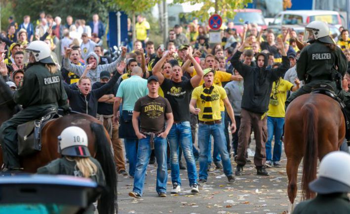 141-е по счету дерби "братьев-врагов" началось с массового побоища фанов. Около 600 "ультрас" из Гельзенкирхена у стадиона напали на дортмундских болельщиков, которые тоже не остались в долгу – желто-черные, быстро собравшие приблизительно такой же по численности "отряд", нанесли ответный удар. Хулиганы швыряли друг в друга камни, бутылки, дело дошло даже до возведения баррикад. Чтобы остановить сражение, полиции пришлось применить водометы. Среди участников беспорядков немало раненых, повреждения получили и восемь полицейских. Более 200 хулиганов были доставлены в участки.