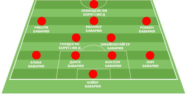 Стартовый состав: НОЙЕР Бавария – ЛАМ Бавария, БОАТЕНГ Бавария, ДАНТЕ Бавария, АЛАБА Бавария – ШВАЙНШТАЙГЕР Бавария, ГЮНДОГАН Боруссия Д – РОББЕН Бавария, МЮЛЛЕР Бавария, РИБЕРИ Бавария – ЛЕВАНДОВСКИ Боруссия Д.