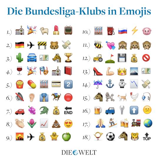 Перед вами все клубы бундеслиги, изображенные при помощи смайликов, по пять на команду. Каждая из картинок имеет отношение либо к команде, либо к городу, который она представляет. Попробуйте догадаться, кто есть кто! Ответы и подробное объяснение можно найти под картинкой.