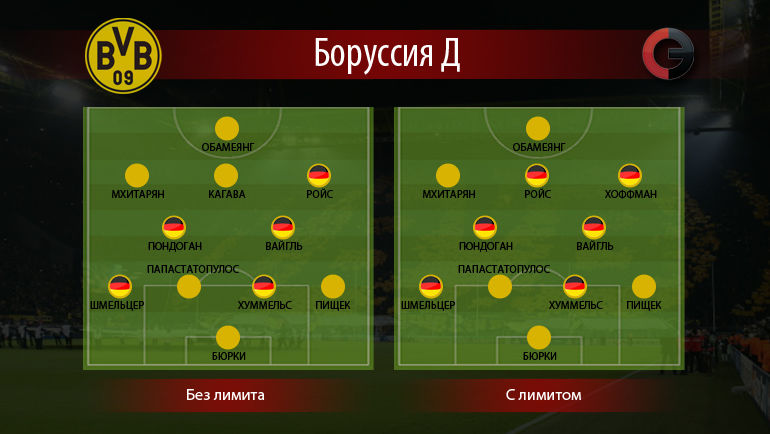 У дортмундцев не будет проблем с перестроением на "5+6". Вайгль уже может считаться железным игроком основы, а Хоффмана Томас Тухель и так собирался потихоньку внедрять в основу – не зря же тренер взял хавбека с собой из "Майнца". Многие ключевые игроки (Ройс, Шмельцер, Хуммельс, Гюндоган) – немцы. Таким образом, "Боруссии" даже не придется возвращать в основу Вайденфеллера.