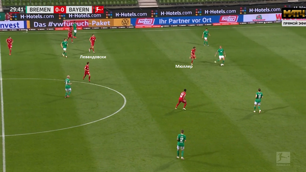 Мюллер же полезен при контрпрессинге: возвращает владение сам / реагирует на действия партнеров, моментально обыгрываясь через короткий пас. Они с Левандовски дополняют друг друга: поляк может опускаться глубже, чтобы цепляться за мячи, а немец выдвигается вперед, чтобы прессинговать / открываться под передачи.