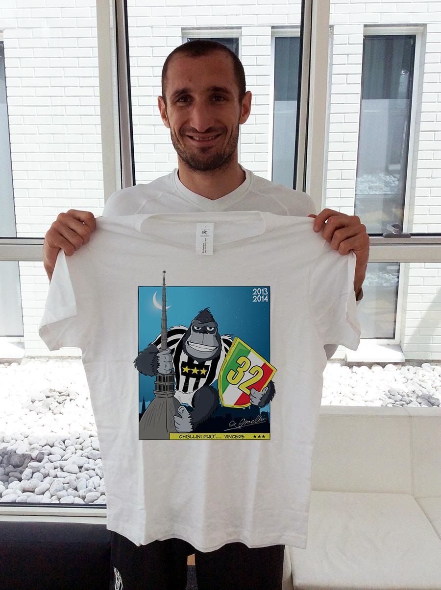 Защитник "Ювентуса" Джорджо Кьеллини презентовал памятную футболку, посвященную победе в чемпионате Италии-2013/14. На футболке изображена горилла, облаченная в игровую форму туринской команды.