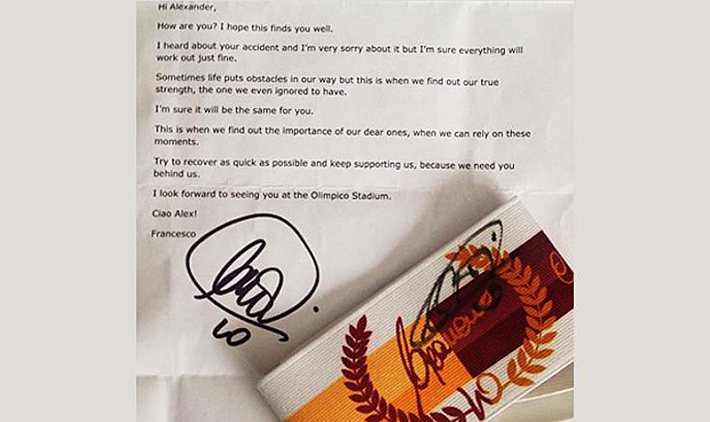 Узнав, что Алекс Линдаль попал в аварию, получил серьезные травмы и пока парализован (о случившемся в клуб сообщил друг Алекса Юхан), Тотти отправил в Швецию письмо на английском языке и приложил свою капитанскую повязку, информирует Corriere Dello Sport. "Иногда жизнь создает нам трудности и ставит препоны. Но именно в таких ситуациях мы узнаем о своих настоящих возможностях и силе характера, которые не замечали раньше. Надеюсь, так и произойдет в твоем случае. Постарайся выздороветь как можно скорее, потому что "Рома" нуждается в твоей поддержке. Жду тебя на нашем стадионе", – так выглядит часть письма, написанного настоящим капитаном. (Александр БОБРОВ)