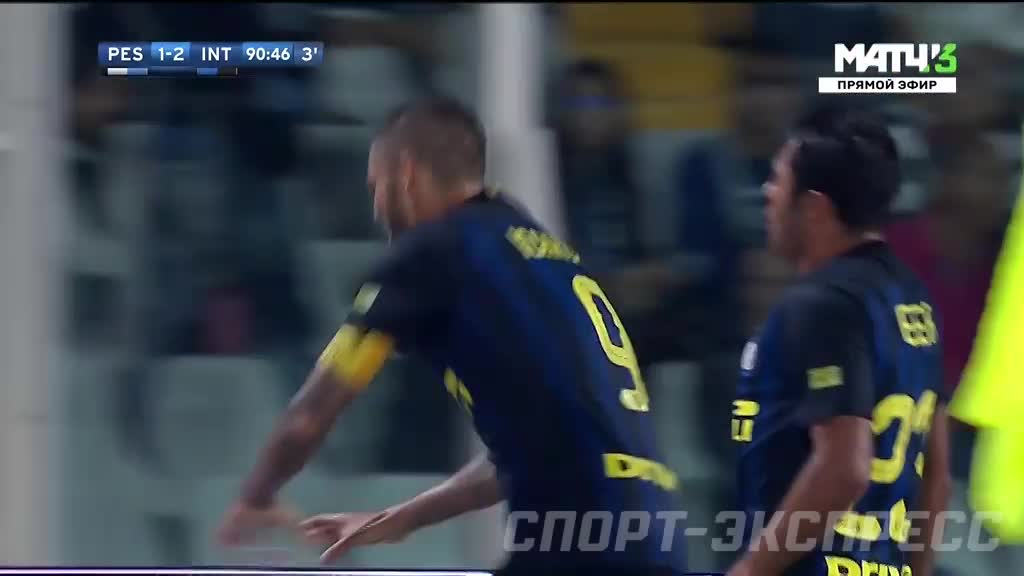"Интер" в гостевом матче 3-го тура группового турнира чемпионата Италии победил "Пескару" – 2:1. Дублем в составе миланского клуба отметился нападающий Мауро Икарди, забивший решающий гол в компенсированное время второго тайма.