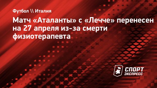 Матч 34-го тура чемпионата Италии по футболу между «Аталантой» из Бергамо и «Лечче» перенесли на 27 апреля из-за смерти физиотерапевта «Лечче» Грациано Фиориты, сообщается на официальной странице желто-красных в социальных сетях.