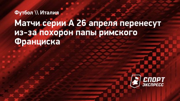 Игры 34-го тура чемпионата Италии, которые запланированы на 26 апреля, пройдут в другие даты из-за похорон папы римского Франциска, сообщает ANSA.