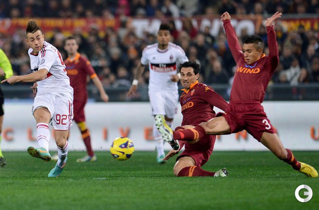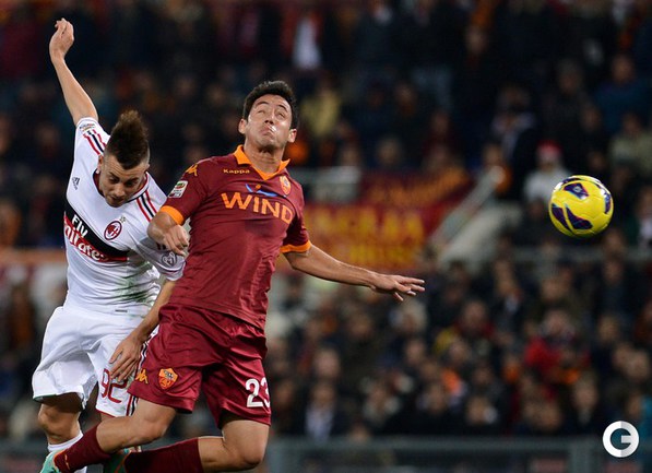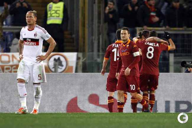 22.12.2012. Футбол. Чемпионат Италии. Сериа А. 18-й тур. "Рома" - "Милан" - 4:2 (3:0). Голы: Бурдиссо, 12 (1:0). Освальдо, 23 (2:0). Ламела, 30 (3:0). Ламела, 61 (4:0). Паццини, 87, с пенальти (4:1). Боян Кркич, 88 (4:2).Удаление: Маркиньос ("Рома"), 78. Фото AFP и REUTERS