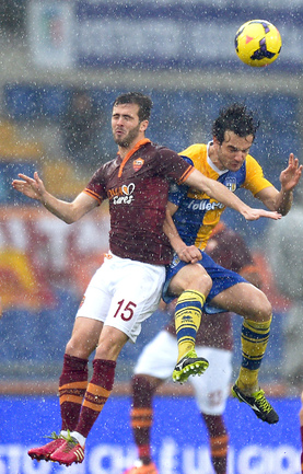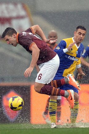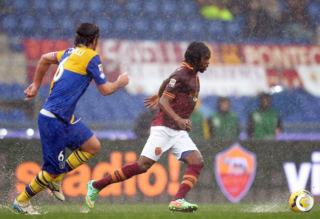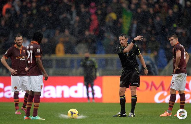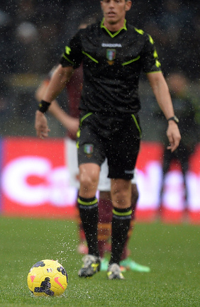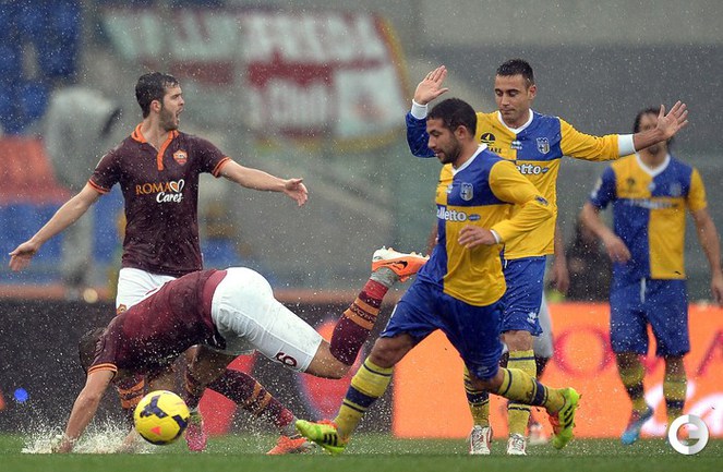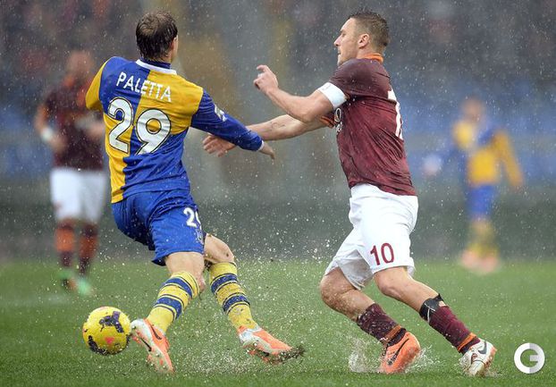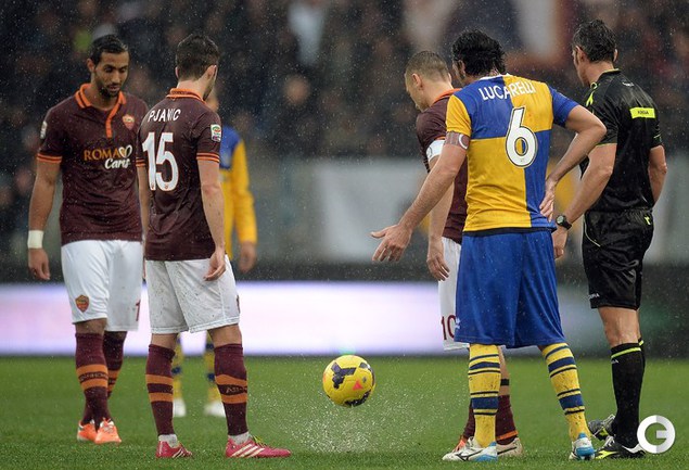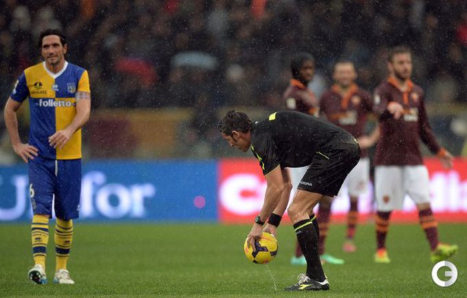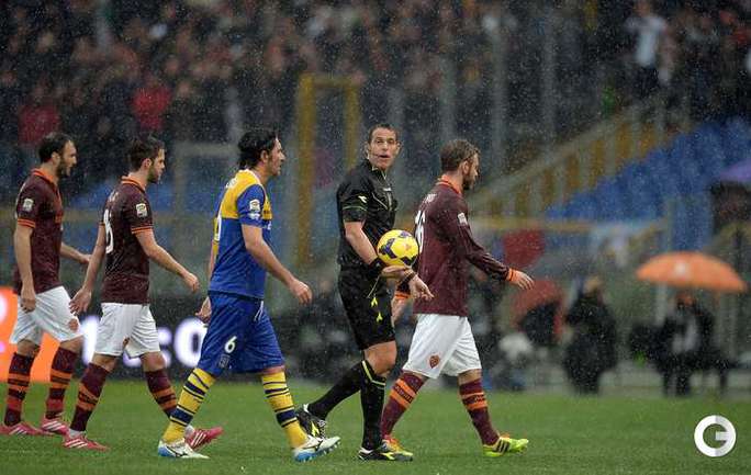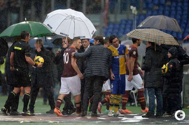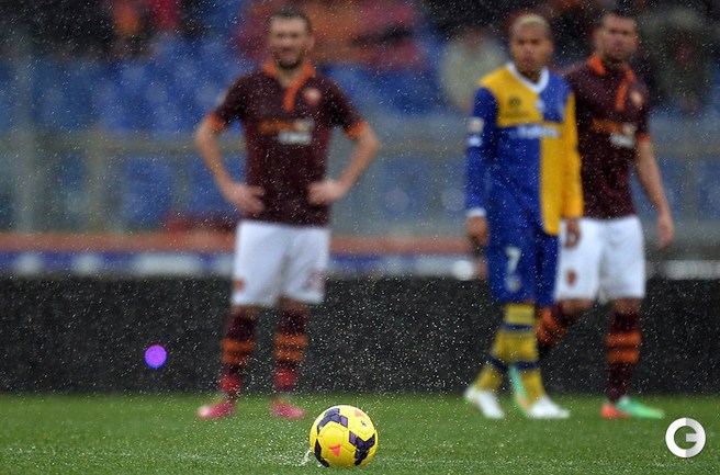 Сегодня. Рим. Матч 22-го тура чемпионата Италии между "Ромой" и "Пармой", прерван на 11-й минуте из-за дождя и сегодня сыгран не будет. Фото AFP.