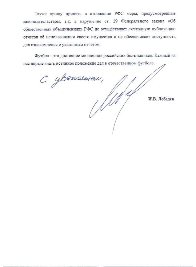 "Ситуация вокруг РФС и его долгов не может и не должна оставаться без внимания со стороны государства. И если Счетная палата не вправе проверять его деятельность, то Минюст имеет на это право по закону "Об общественных объединениях". Поэтому я направляю запрос министру юстиции с целью организовать проверку деятельности РФС, в том числе и финансовую. А также прошу Минюст принять меры к РФС с целью публикаций отчетов об использовании своего имущества в соответствии с законом "Об общественных объединениях", – написал Лебедев в своем твиттере.