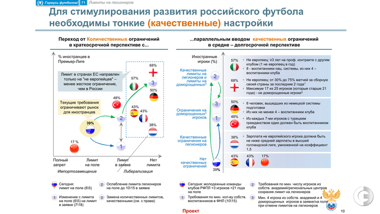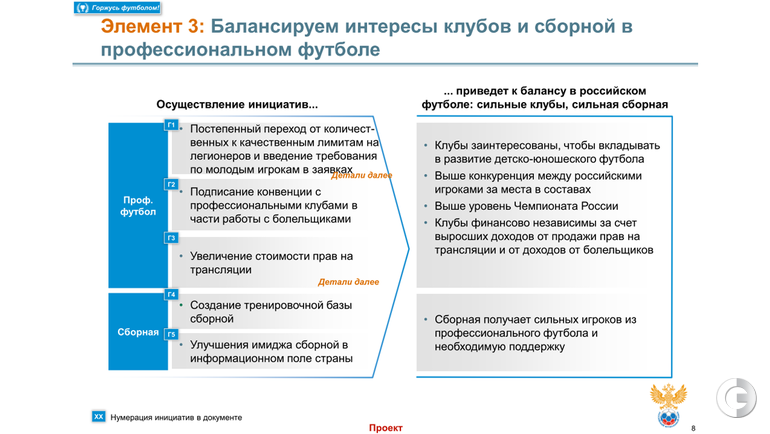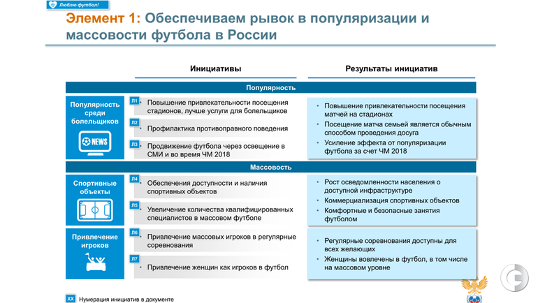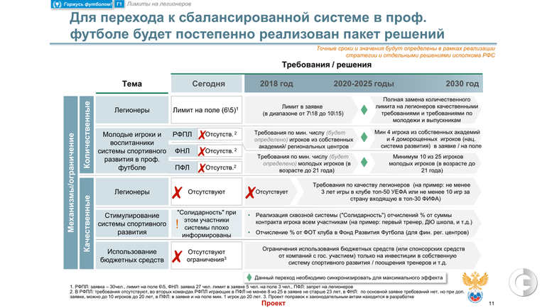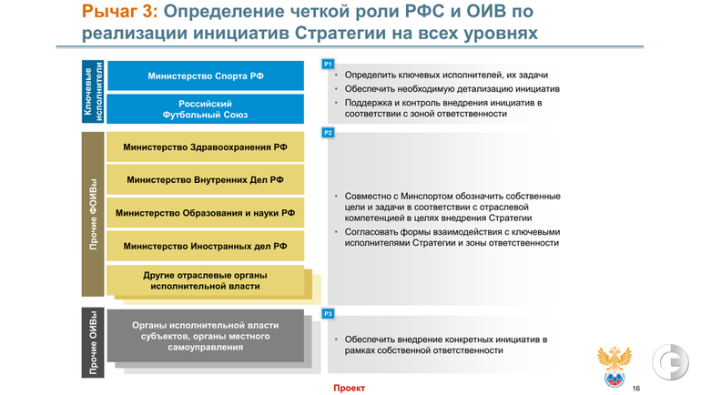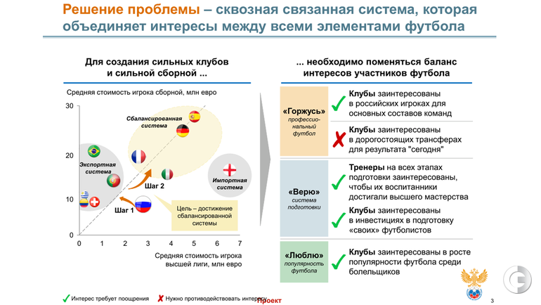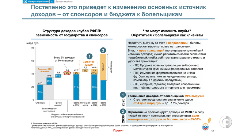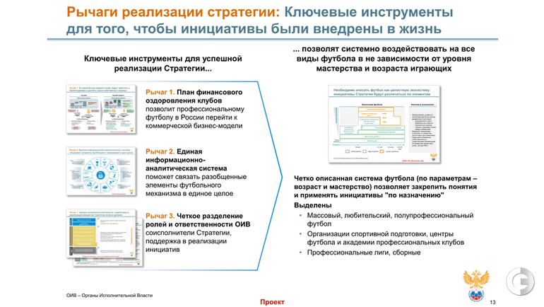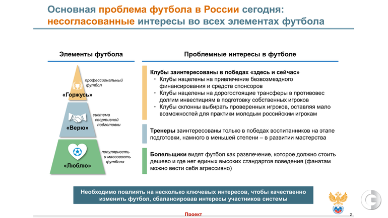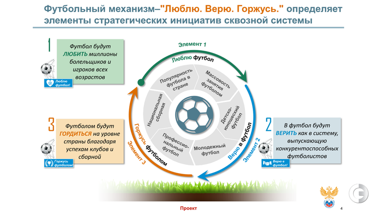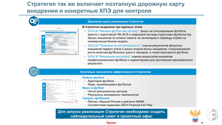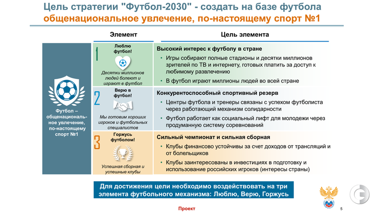 На конференции РФС, которая пройдет 24 сентября в Москве, планируется обсуждение реализации проекта под названием "Общенациональная стратегия развития футбола в РФ на период до 2030 года". В пятницу, 23-го числа, его обсудят на исполкоме. В распоряжении "СЭ" оказался презентационный вариант документа. Приводим самые любопытные выдержки с планами и целям.