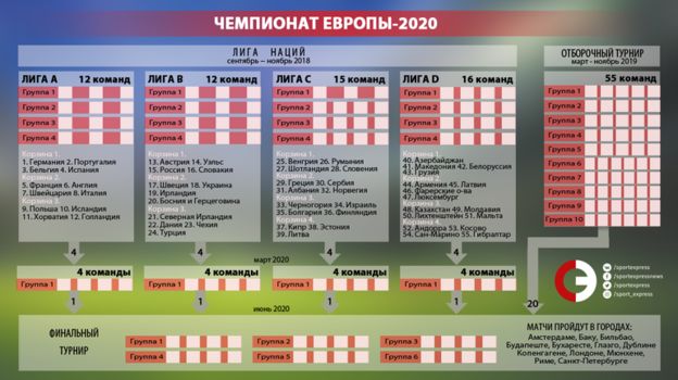 А отборочный турнир Евро-2020 пройдет с марта по ноябрь 2019-го. По его итогам определятся 20 обладателей путевок – по две лучшие команды из 10 групп, по которым распределят 55 команд (по 5 или 6 в каждой). Жеребьевка отборочного турнира запланирована на 2 декабря 2018-го (в Дублине).