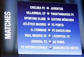 В итоге были сформированы следующие 8 пар: "Челси" (Англия) - "Ювентус" (Италия), "Вильярреал" (Испания) - "Панатинаикос" (Греция), "Спортинг" (Португалия) - "Бавария" (Германия), "Атлетико" (Испания) - "Порту" (Португалия), "Лион" (Франция) - "Барселона" (Испания), "Реал" (Испания) - "Ливерпуль" (Англия), "Арсенал" (Англия) - "Рома" (Италия), "Интер" (Италия) - "Манчестер Юнайтед" (Англия). |
