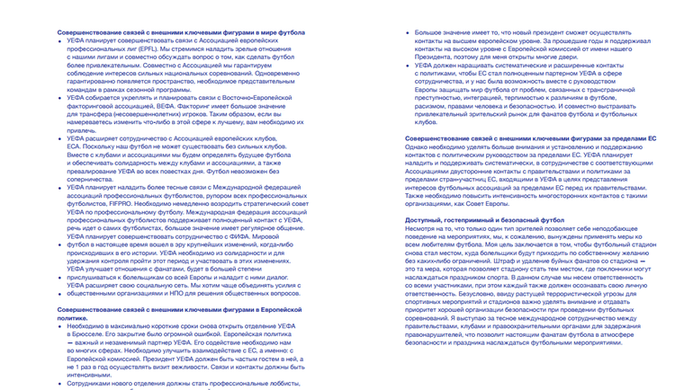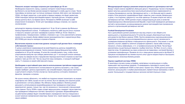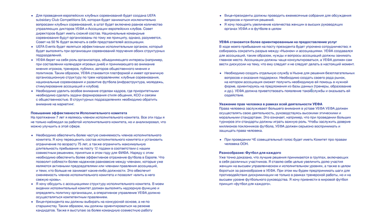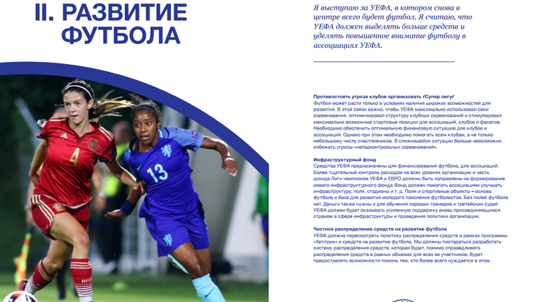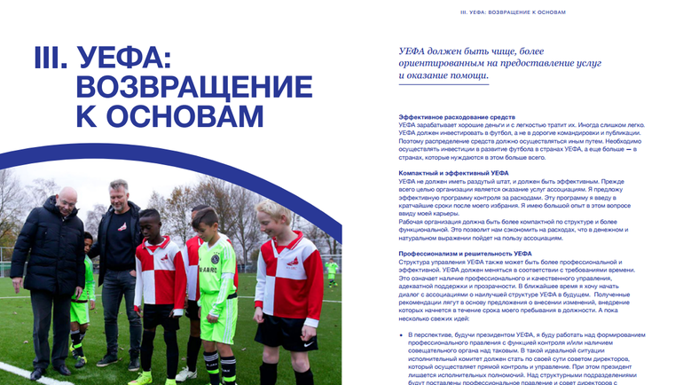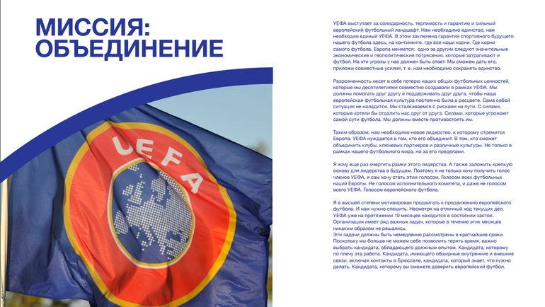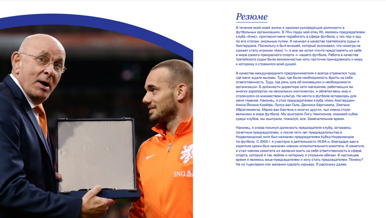 Глава Королевского футбольного союза Нидерландов Михаэл ван Праг на своем официальном сайте опубликовал манифест, с которым он идет на выборы президента УЕФА, запланированные на 14 сентября. В манифесте функционер описывает основные положения своей предвыборной программы. Причем документ опубликован на нескольких языках, включая русский.