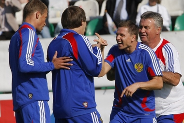 Тем временем первые футболисты страны вовсю купались в доброй атмосфере первой команды страны. 18 игроков начали работу с пробежек и растяжек. После них сборная разделилась на два "квадрата". В игре в одном из них активное участие принимал сам Хиддинк. Голландец несколько раз под овации трех сотен болельщиков оказывался в центре и неторопливо пытался перехватить мяч. В итоге тренера каждый раз "выручали" Погребняк, Аршавин и другие.
