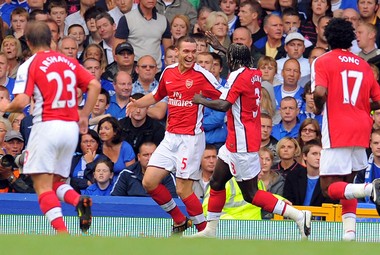 Как и во всех встречах тура, перед стартовым свистком стадион на минуту дружно начал аплодировать в память о сэре Бобби Робсоне. Первый мяч соорудил Бендтнер. Форвард "Арсенала" (датчанин поменял 26-й номер на 52-й, обыграв цифры из оставленного Адебайором 25-го) принял перевод на правом фланге, развернулся в окружение двух защитников, прошел Бэйнса и подключил Фабрегаса. Капитан оперативно отдал передачу вдоль штрафной, а Денилсон красивым ударом попал в левую от себя "девятку". Вскоре Денилсон проявил себя в обороне, вынеся мяч с линии ворот после подачи углового и скидки Феллени. Как оказалось, до конца матча более реальных моментов у "Эвертона" не было. А у лондонцев перед перерывом в атаке показали себя оба центральных защитника. Ван Перси и Фабрегас подавали со "стандартов" в штрафную, где сначала Вермален и Галлас выскакивали из-за спин соперников и спокойно поражали цель. Причем до них точным ударом отметился Аршавин, красиво перебросивший Хоуарда. Но этот гол был отменен из-за офсайда.