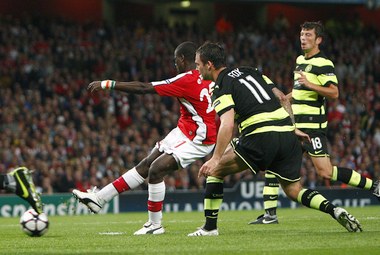 Арсен Венгер, оставив в резерве Аршавина и ван Перси и вне заявки травмированного капитана Фабрегаса, предпочел не вносить лишнюю суету в защитную линию и выставил всех основных оборонцев. "Селтик" начал бойко, но по большому счету соперник шансов ему не предоставил. А тут еще в чем-то помог "канонирам" Мехуто Гонсалес. Он покарал гостей пенальти в довольно спорном эпизоде с падением Эдуарду. Бразилец после проникающего паса в резвой атаке проткнул мяч к лицевой и с удовольствием рухнул на газон, проскочив Боруца. Вратарь всем видом показывал, что соперника сбивать даже не думал, но его пылкие уговоры маститого рефери не смутили. Одетый по-торпедовски испанец (белый верх, черный низ) указал на "точку", с которой сам "пострадавший" и открыл счет.