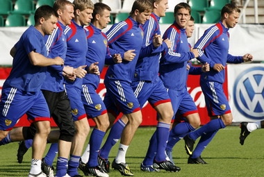 Сборная России провела на стадионе имени Стрельцова свою первую тренировку в рамках подготовки к матчам отборочного турнира чемпионата мира-2010 с Лихтенштейном и Уэльсом.