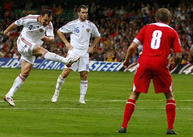 Россия: 1. Акинфеев, 2. Анюков, 4. Игнашевич, 5. В. Березуцкий, 13. Янбаев, 15. Быстров, 11. Семак, 8. Семшов (9. Павлюченко, 71), 17. Зырянов, 10. Аршавин (к), 16. Кержаков (3. Ребко, 84).