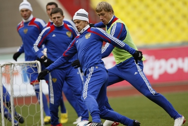Сборная России в рамках подготовки к решающему матчу отборочного турнира чемпионата мира-2010 cо сборной Германии в Москве провела во вторник свою первую тренировку в Лужниках.