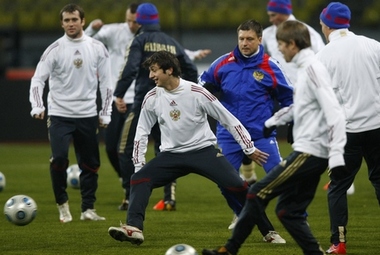 Первый ход традиционно был за хозяевами. Припоздавший к четырем пополудни в конференц-зал главной арены страны Гус Хиддинк ограничил свою пресс-конференцию 20 минутами. После нее голландец отправился к полю, где команда уже начала разминку под руководством Игоря Корнеева. Вместо положенных по регламенту 15 минут журналистам было дозволено наблюдать за занятием гораздо больше – около 40. После втягивающих упражнений футболисты вдоволь поиграли в "квадраты" без участия трех вратарей. Шуток и смеха почти не было, все 24 российских сборника работали сосредоточенно и сконцентрированно. Когда же репортеров попросили удалиться, игроки как раз делились на три команды – "белых", "оранжевых" и "зеленых". Причем в одной из групп собрались игроки с уклоном в атаку (Сычев, Погребняк, Павлюченко, Билялетдинов, Жирков), в другой – в оборону (братья Березуцкие, Игнашевич), в третьей – и в ту, и в ту (с Аршавиным во главе). До конца часовой тренировки, насколько удалось подсмотреть, в таком сочетании они и провели поперек поля своеобразную многосторонку.