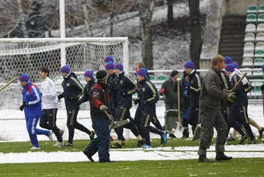 Появление сборной на Восточной улице было запланировано на 10:30, однако автобус с первой командой страны въехал на территорию стадиона почти на полчаса позже. На поле же сотрудники стадиона с помощью десятка лопат и одного трактора продолжали очищать траву от выпавшего снега. Так что, когда 24 футболиста и тренерский штаб появились на скользкой беговой дорожке, у левых ворот еще оставался неубранный белый фрагмент. Он был устранен уже в процессе разминки. Пока Хиддинк неторопливо расхаживал по перенесший новый удар от московской погоды траве, Игорь Корнеев наматывал круги вместе с игроками и чередовал беговые упражнения. Следом сборники переместились в дальний правый угол поля, где разбились на три традиционных "квадрата".