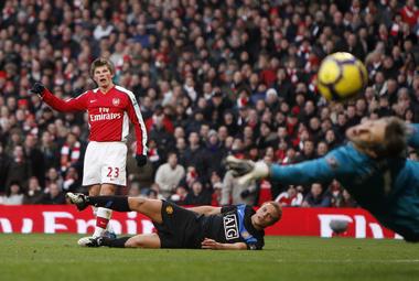 В части с противостоянием с чемпионской командой сэра Алекса Фергюсона этот план потерпел крах. Если в начале встречи на "Эмирэйтс" соперники опасно атаковали и контратаковали, то потом гости расставили все по своим местам. Теперь пустое гадать, как бы сложился один из центральных матчей премьер-лиги, улыбнись удача Аршавину (именно он, пожалуй, стал в этот вечер главной угрозой в линии нападении "Арсенала") хотя бы в одной из трех попыток. В двух из них в начале игры россиянин оставлял в статистах Брауна рывками с левого фланга и лихо закручивал в дальний угол мимо долговязого ван дер Сара. Мяч летел рядом, но не в цель. Не так, как у гостей.