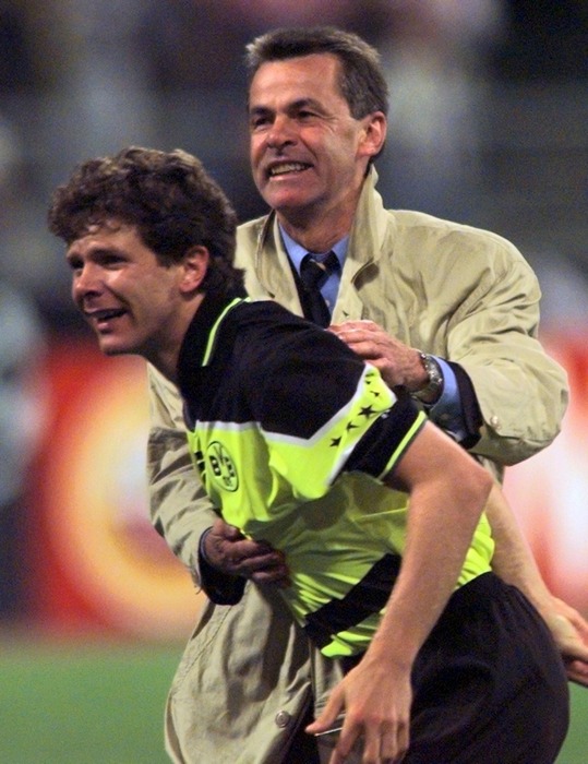 28 мая 1997 года. Финал Лиги чемпионов. "Боруссия" Д - "Ювентус" - 3:1. Оттмар ХИТЦФЕЛЬД и знаменитый полузащитник "Боруссии" Андреас МЁЛЛЕР. Фото REUTERS