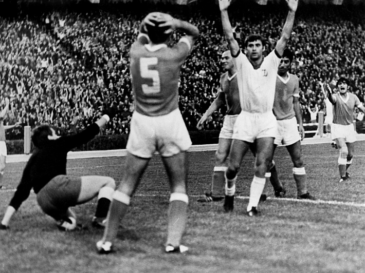 1966 год. Киев. Только что нападающий киевского "Динамо" Анатолий БЫШОВЕЦ поразил ворота "Нефтчи". Фото - Ефим ШАИНСКИЙ