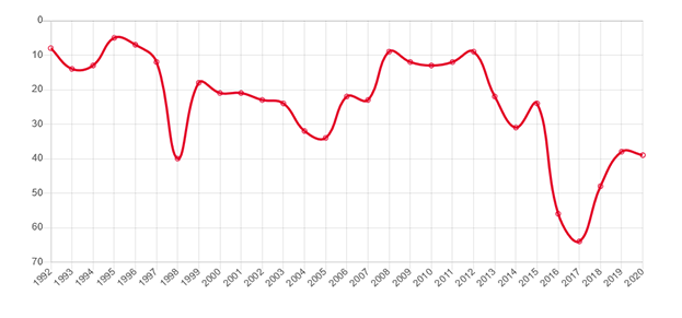 ФИФА ввела свой рейтинг в самом конце 1992 года, когда самостоятельной сборной России было всего несколько месяцев. Наша страна стала правопреемницей СССР и СНГ и сходу заняла достаточно высокую восьмую строчку в первом рейтинге. Постепенно Россия начала опускаться в таблице, к ЧМ-94 откатившись на 20-ю позицию. После турнира в США сборную возглавил Олег Романцев, за чем последовал стремительный подъем: в 1996 году Россия занимала третью строчку в рейтинге ФИФА. Ни до, ни после такого не было.