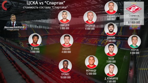 В преддверии центрального матча 26-го тура премьер-лиги "СЭ" сравнил стоимость ориентировочных стартовых составов ЦСКА и "Спартака".