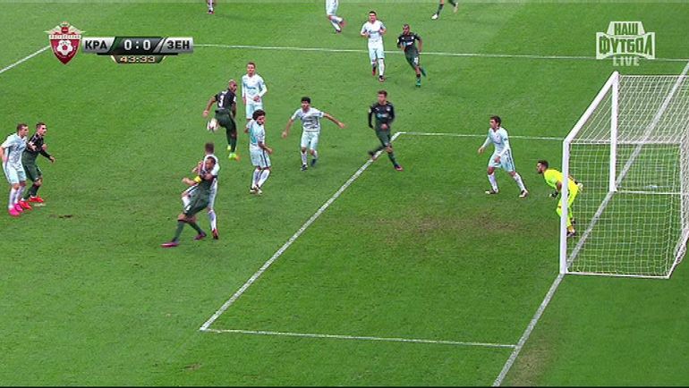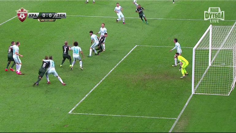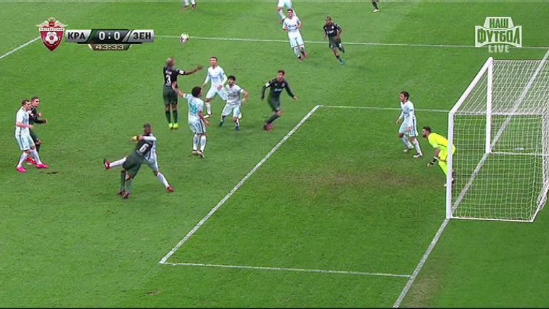 Непростой для арбитра эпизод произошел на 9-й минуте, когда Смолов, убегавший к воротам зенитовцев, вдруг упал. Арбитр, находившейся в неплохой позиции, жестом показал, что игру следует продолжить. Видеоповтор не позволяет точно увидеть все детали единоборства Смолова с Кришито. Однако видно, что защитник "Зенита" непродолжительное время левой рукой держал Смолова за майку. (Александр БОБРОВ)